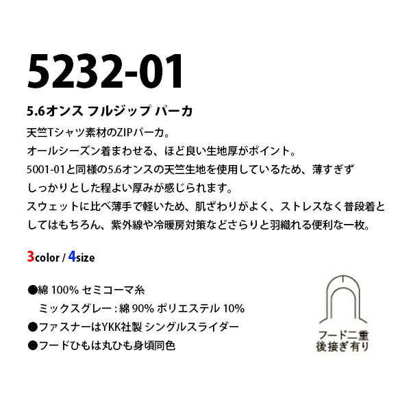 天竺Tシャツ素材のZIPパーカ