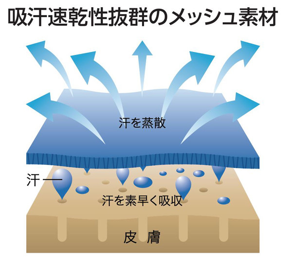・汗などの水分を素早く吸収し、拡散します。