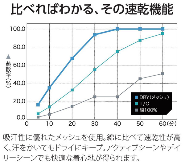 衣服内を快適な状態に保つと共に、優れた速乾性で洗濯後も早く乾きます。